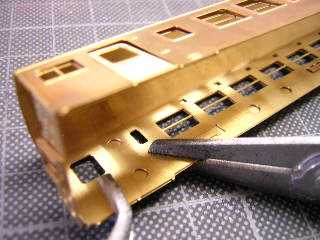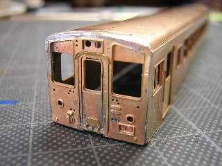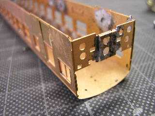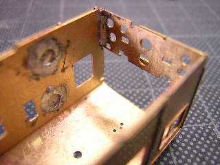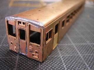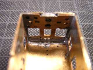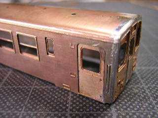 9)前面パーツです。 裏板を折り曲げてはんだ付けします。 折妻形態となりますので、あらかじめ貫通路横に設けられた 筋をPカッターで軽くなぞっておきます。 |