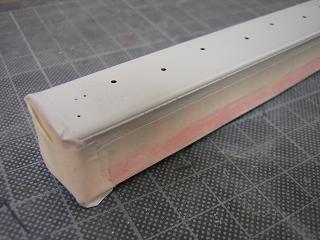 14)前面パーツと側面の接合 側板の接合面には縦に雨樋がモールドされていますが、 平滑処理を行うためには邪魔なので、一旦削り落しました。 後でt=0.3mmプラ板等で再生します |