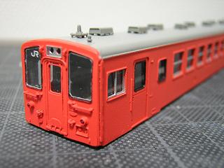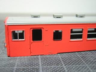 24)細部色入れ 窓枠Hゴムにはつや消し黒を、ユニットサッシには銀色を 面相筆で色差しします。 併せて、同時塗装を行ったベンチレータ(TOMIX製PB-103: 415-700系用)も実装しています。 |