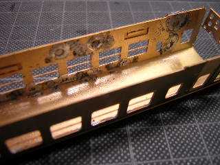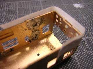 13)前面パーツの固定(表側) 屋根との接合部に隙間があれば、はんだをパテ代わりに 使用します。 あとで、ヤスリやキサゲ刷毛等で仕上げますので、現時点 では多少汚くても、そのままとしておきます。。 |