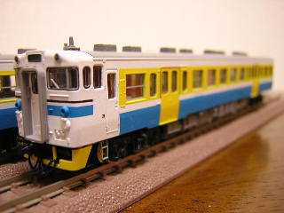 キハ40−2135(右) ・塗装は3色調合しています。 1)上部の白:GM37(国鉄白3)にGM21(小田急アイボリー)を 加えたもの 2)上部の黄:GC4(黄)とGC58(黄橙色)を調合したもの 3)下部の青:GC34(スカイブルー)+GM22(小田急青)を調合 したもの。 4)黒ライン:GC2(黒) 塗装順序はグンゼのメタルプライマー→白→貴→青→黒の 順で吹いていきました。 前面のバーコードと、側面の細い黒線(窓下)が無いため、非常に 楽でした。 【注】 GM:グリーンマックスカラー GC:グンゼカラー |