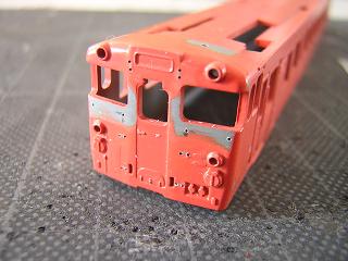 屋根塗装と車体組立 実車の屋根塗り分けとして、運転台の上はグレーになっている 車両が多いようです。 よって、屋根と同じグレーを吹いておきます。 その後車体にGM44:半光沢を吹きつけ、デカール類の表面保護を 行った後、組立に入ります。 写真は信号炎管を取付けた状態。 |