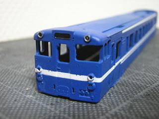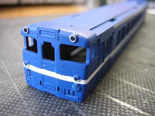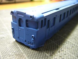 車体青塗装 車体のブルーを吹きます。 塗料はGSIクレオスNo.110(キャラクタブルー)をベースに GM16:青20号を混ぜたものを使用しています。 |
