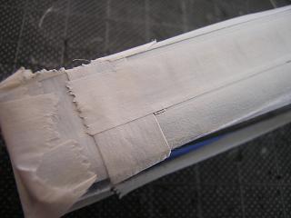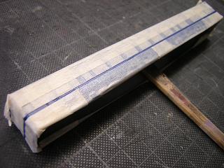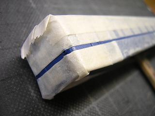 車体白帯塗装2 マスキング完了。この時点でまたクリアを吹いておきます。 |