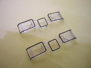床下加工 TNカプラーは床板に両面テープで固定する為、突起物類はカットして います。 また台車に当たらないように不要な部分をカットしています。 右が不要部分を取り除いた状態。 |