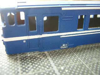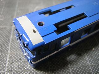 車体白帯塗装1 白を吹く前にGM40:クリアをひと吹きします。 |