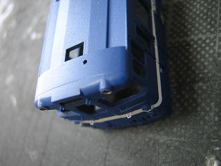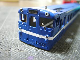 各種モールド削除 信号炎管を削取り、Φ0.8mmの穴を開けておきます。 また前面手摺も別パーツ化するため、モールド表現を削り取り、 Φ0.3mmのドリルで穴を開けておきます。 しかし、目が悪くなったのか焦点が合いません..._| ̄|○ |