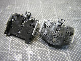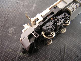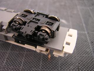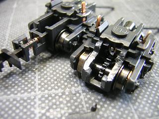 床下加工 カプラーをTN化(JC63)する為、旧カプラーを台車根元からカット します。 また台車のギヤケースもカプラーと干渉する為、大幅にカットして おきます。 右がカプラーをカットした状態。 |