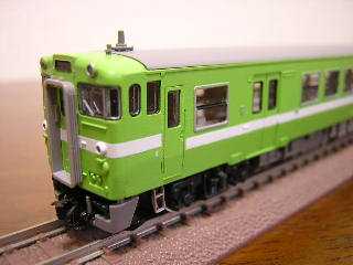 キハ47福知山色 キハ47−1(右) キハ47−1015(左) ・0番台、1000番台共にベースはKATO製キハ47-1000です。 ・塗装は白と茶は調合することになります。 1)上部の緑:GC64(ルマングリーン)にGC2(黄色)とGM37 (国鉄白3)を加えたもの 2)白の帯:GM37(国鉄白3) 塗装順序はグンゼのメタルプライマー→下地灰→緑→白帯 の順で吹いていきました。 (★なお、この車両は転属し、現在当鉄道には所属しておりません。) |