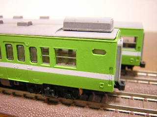 キハ47−1(手前) キハ47−1015(奥) ・0番台改造は、津山鉄道部色と同様、4位側窓をt1.2プラ板で 埋めた後、トイレ用窓穴を開け直しています。 また屋根は水タンク設置部が低屋根となっているため、妻板面 から約18mmで切断し、t=0.5mmプラ板で作成した低屋根部を 繋いでいます。 ・なお、水タンクは同じくKATOのキハ48-0よりキャスト成型した 物を使しています。 |