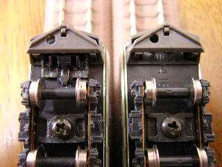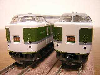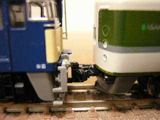 クハ189−504(左)、クハ189−8(右) ・左がTNカプラー化しています。(右がオリジナル) TNカプラ−自体は、台車と干渉しない用に出来る限り不要 部分をカットし、両面テープで床板に接着しています。 ただし、この方法はKATOの特長である、ヘッドマーク交換 機能を殺してしまいますので、485系などへの適用は別途 要検討です。 189系はヘッドマーク交換機能がありませんので問題 ありませんが...。 |