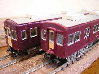 2050(右)、2060(左) ・大阪寄り、制御車です。 ベースはグリーンマックスのエコノミーキットを使用しています。 左の2050は編成中間の元制御車で、運転台は撤去されています。 なお、実車では妻面の引き戸はありませんが、編成を組むと 見えない事から、加工せず、そのままとしています。 |