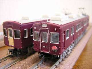 2010(左)、2000(右) ・中間電動車です。 2000系の妻面は引き戸の無い幅広貫通路の為、キットの妻面とは 異なりますが、そのままとしています。 どこかから妻面パーツが発売されていたと思いますが、連結すると そんなに目立ず、対改造効果が少ない事(というかめんどくさい^^;) ことから割切っています。 車番と社紋はグリーンマックスの阪急インレタ(白)を使用しています。 < なお編成は下記としています。 大阪 神戸 2050+2000+2051+2001+2060+2010+2091+2011 |