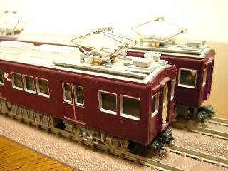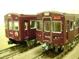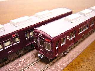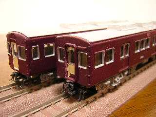 3083(左)、3082(右) ・大阪寄り、制御車です。 ベースはグリーンマックスのエコノミーキットを使用しています。 ・新阪急マークの設定としています。 ・左の3083は編成中間の制御車で、方向幕改造を受けていません。 時々編成の先頭にたたせ変化が楽しめるように特急看板をつけて います。 ・これも10年ぐらい前に作った代物ですので、粗だらけです。 |