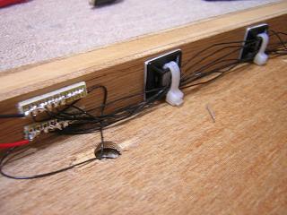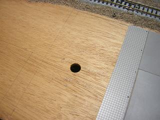 | ・モジュール側配線 建物へのライトユニット組み込みが完了しましたので、 モジュール側の配線を行います。 建物側の端子位置に合うようにモジュール側にも端子を 設けます。 まずは配線用の穴を開けておきます。 |