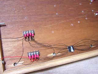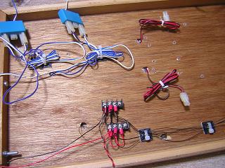 | ・モジュール側配線 ボード裏側で照明用の配線をまとめておきます。 左の基板で、各建物への電源を分配しています。 写真は駅モジュール(その1) |