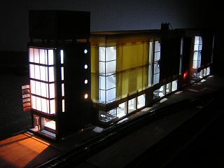 | ・モジュール夜景その7 駅前ビル群。 真ん中の小型ビルで赤く光っているのは、建物内部の電球が 透けている為です。 後ほど透けない様に処置を行いました。 (もっとも熱で壁が変形していましたが...。) |