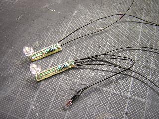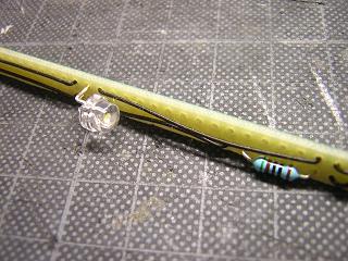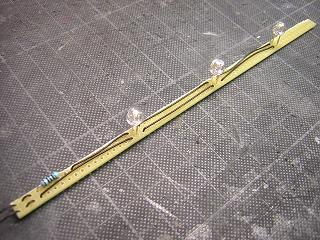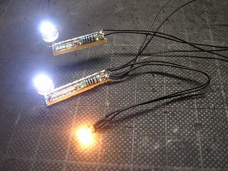 | ・総合ビル(7階建て仕様) ライトユニットの組立完了。 LEDは20mAの仕様ですが、そこまで流さなくて充分な光量が 得られます。 今回電圧は9Vとし、電流制限抵抗を510Ω(1/4W)を使用して います。 LEDのVFは3〜3.8Vで3個並列接続していますので、ざっくり LED1個に流れる電流は ((9V-3.4V)÷510Ω)/3=3.7mA となります。 抵抗の消費電力も(3.7mA×3)^2×510=61.7mWですので、 1/4W=250mWの抵抗でも充分マージンありの計算です。 |
