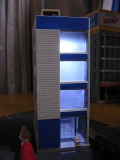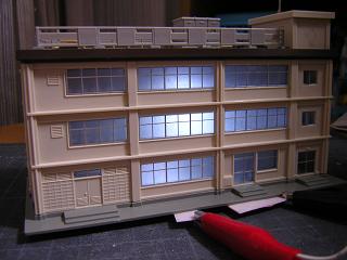 | ・総合ビル(7階建て仕様) ビルに組み込んでみました。 この場合LEDが窓ガラスに向いているので、壁に照明が 付いているような感じです。 実際に点灯させてみると、1階フロアが暗いようです。 |