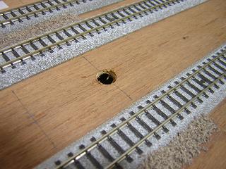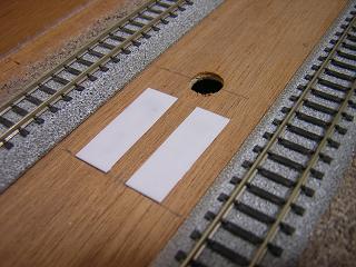 ・駅用ライトの配線 ホーム側に電線の逃げる穴(Φ1mm)を開けておきます。 |