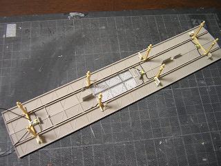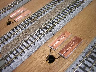 ・駅用ライトの配線 建物と同様にプラ板(今回はt=1.2mm)と粘着シートタイプの 銅板を用い、接点を構成します。 あとは、モジュール側の配線を行えば、ホームの照明化は 完了です。 2009-10/25 |