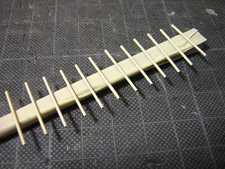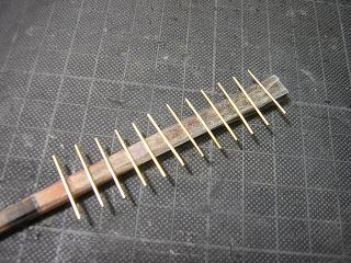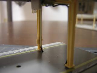 ・駅用ライトの配線 ホーム屋根からの電線を如何に地面側へ配線するかが 悩みでしたが今回外径Φ0.7mm(内径Φ0.5mm)の真鍮製 パイプを使用し、雨樋に見立てて、その中に電線を通すことに しました。 |