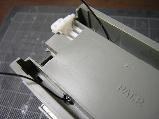 ・総駅用ライトユニット配線 黒い線が電線。 整形された溝の中に電線を這わせています。 (柱の部分は溝の外側に出てしまいますが...) ちなみに写真は品番21-100への処置例です。 |