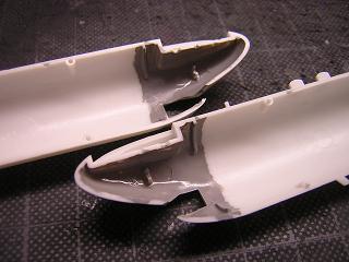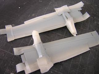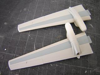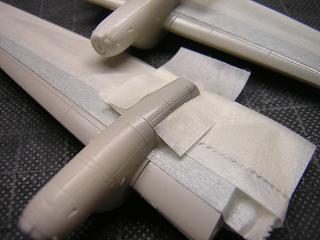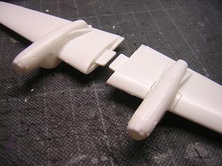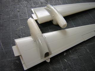 | ・主翼組立 接着剤で固定した状態。 ランナーのバリなどをやすりで削っておきます。 |