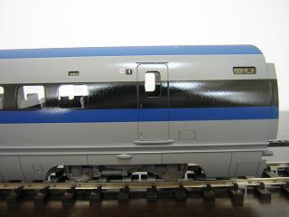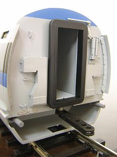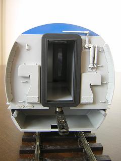 | ・521[1号車] 妻面からのカット。 室内仕切りの自動ドアも、楕円形の窓が再現されています。 |