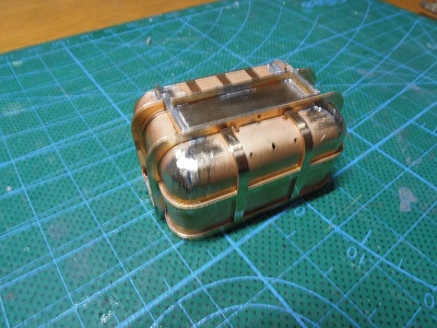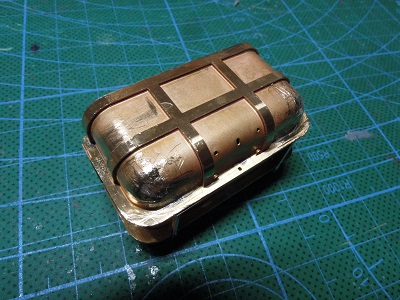 ・車体組立(2020/5/31) まずは函体から。 位置決めのネジで固定して、各パーツを半田付けします。 補強帯板の位置合わせも、爪があり簡単に決まります。 函体の隅は、半田を流して丸くなるように成型します。 |