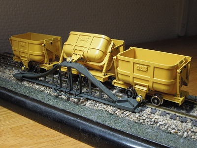 グランビー鉱車3両セット ・道楽ぼーずさんのグランビー転倒装置キットです。 3両セットで函体が傾斜する構造になっています。 |